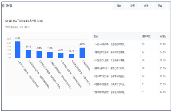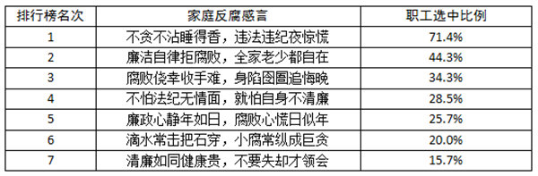 由市体校精心创作“家庭反腐格言”如下7条: 1.不贪不沾睡得香,违法违纪夜惊慌。 2.腐败侥幸收手难,身陷囹圄追悔晚。 3.不怕法纪无情面,就怕自身不清廉。 4.廉政心静年如日,腐败心慌日似年。 5.滴水常击把石穿,小腐常纵成巨贪。 6.清廉如同健康贵,不要失却才领会。 7.廉洁自律拒腐败,全家老少都自在。 学校7月25日组织职工在线从中选择可作为自家的反腐格言1至3条,被选中的家庭反腐格言统计情况如下: