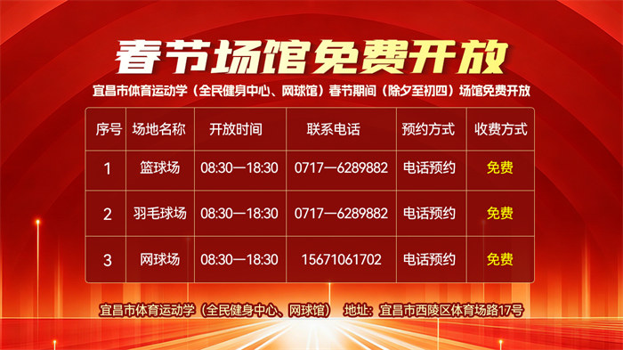 开云中国官方网站(全民健身中心、网球馆)春节期间(除夕至初四)场馆免费开放,详情如下: