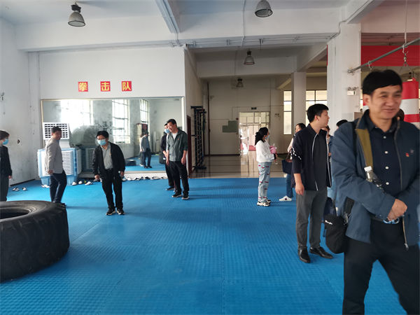 奥体射击馆之行结束后,全体党员冒雨来到学校综合训练馆。综合训练馆是当初为湖北省九运会而筹建,距今已30余年,其部分体育设施已老化。市财政局党员们实地查看篮球馆、拳击馆、跆拳道馆后,纷纷感叹,在如此简陋的条件下能取得辉煌的十六运战绩体校确实不容易!
