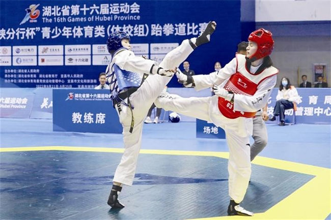 市体校跆拳道运动员王岱兰(左)与选手对决