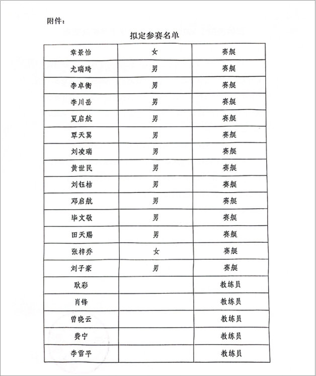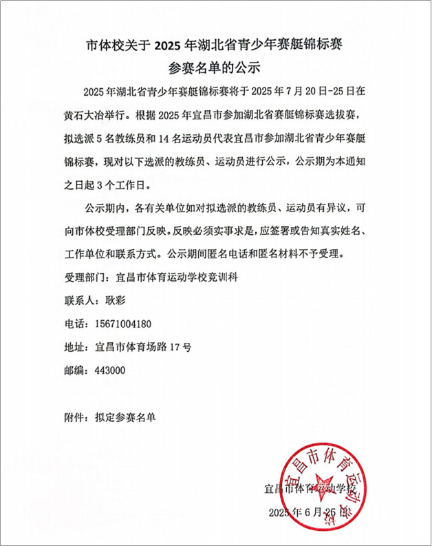 市体校关于2025年湖北省青少年赛艇锦标赛参赛名单的公示