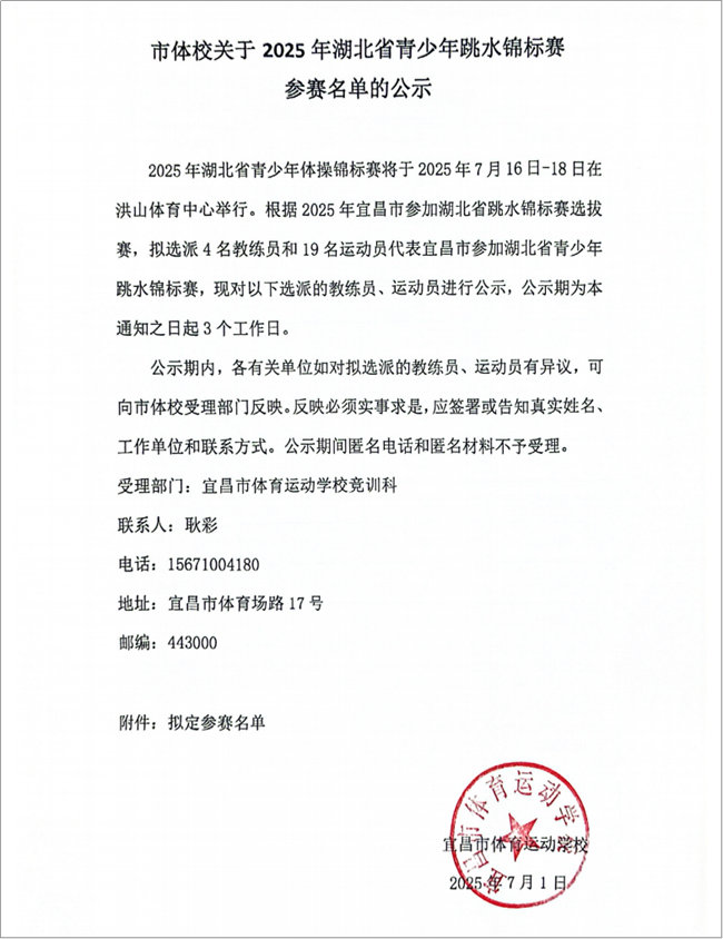 市体校关于2025年湖北省青少年跳水锦标赛参赛名单的公示