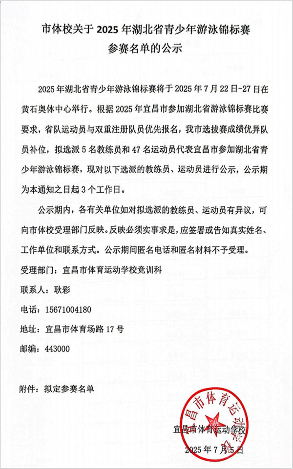 市体校关于2025年湖北省青少年游泳锦标赛参赛名单的公示