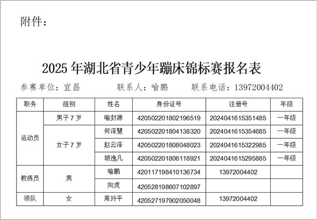 2025年湖北省青少年运动会暨湖北省青少年蹦床锦标赛,将于2025年8月11日-8月13日在湖北省孝感市举行。根据2025年湖北省青少年蹦床锦标赛赛前选拔成绩,拟选派1名领队2名教练员和名4运动员参加,拟参加名单见附件。