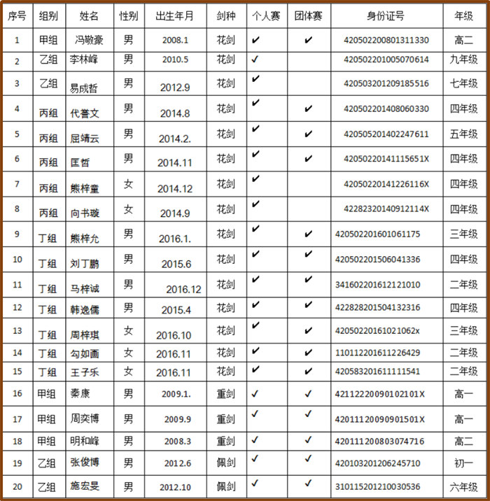 2025年湖北省青少年运动会暨湖北省青少年击剑锦标赛,将于2025年8月4日-8月7日在湖北省咸宁市举行。根据2025年湖北省青少年击剑锦标赛赛前选拔成绩,拟选派2名领队5名教练员、1名工作人员和43名运动员参加,拟参加名单见附件1、附件2。