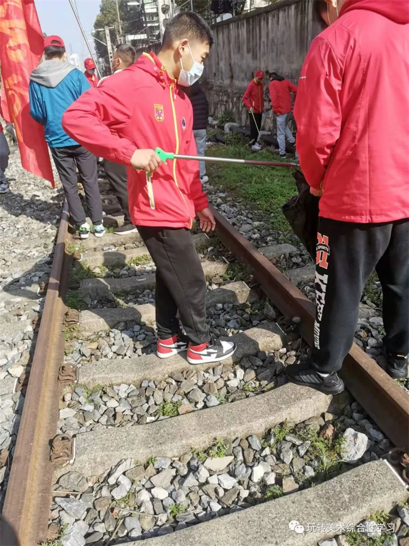 体校学生身着红色校服,在胜利四路铁路沿线捡拾各类垃圾,不放过任何一个角落,为宜昌的环境综合整治助力。