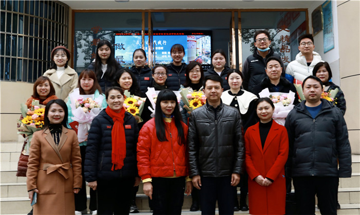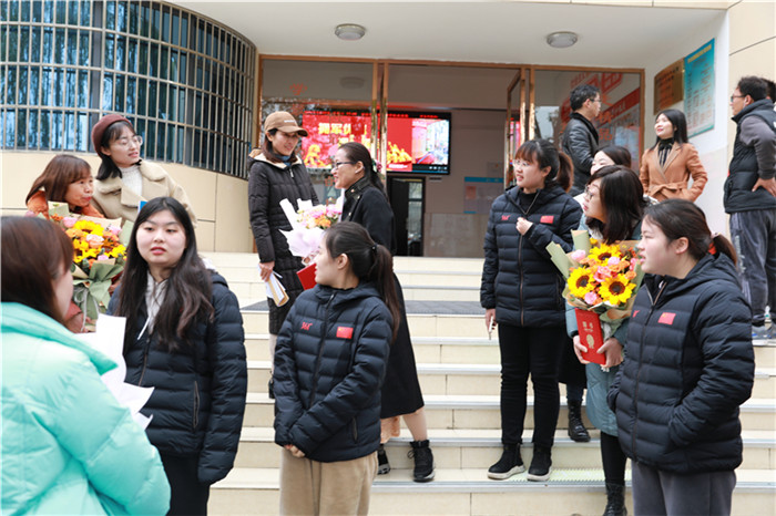 青年教师们郑重地拜师,并为指导老师们献上鲜花。
