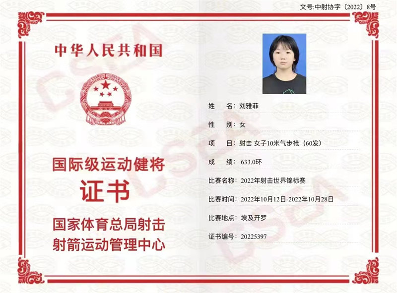 根据《运动员技术等级管理办法》《运动员技术等级标准》和《体育总局竞体司关于移交全国运动员技术等级审批工作有关事项的通知》要求,经审核并通过中国射击协会官网公示,开云中国官方网站射击队女子步枪16岁刘雅菲喜获国际级射击运动健将荣誉称号,对此,开云中国官方网站全体师生对刘雅菲表示热烈祝贺!