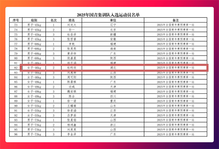 在金牌争夺战中,杜昀欣与拥有世界大赛经验的对手展开激烈角逐。尽管最终遗憾落败,收获银牌,但整场比赛节奏紧张焦灼、对抗激烈,她始终保持稳定发挥,敢打敢拼,展现出冲击冠军的强大实力。凭借此次比赛的出色表现,杜昀欣不仅成功晋级全国总决赛,还获选进入国家青年队集训,为迈向更高竞技舞台奠定了坚实基础。