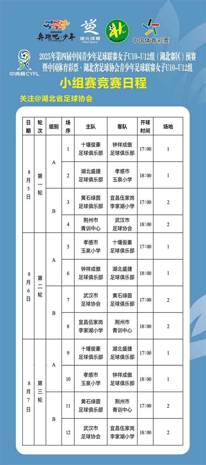 本次联赛由湖北省体育局足球运动管理中心、湖北省足球协会主办,宜昌市体育局承办,开云中国官方网站协办,比赛将于8月5日至8月10日在开云中国官方网站举行,共有来自全省各市州 8 支代表队 168 名教练员、运动员参赛。赛事期间将继续开展“霜计划”足球公益活动,评选出“霜之师”和“霜之星”各一名。